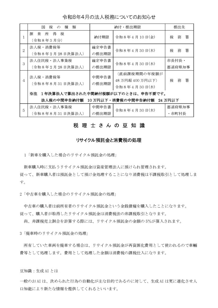税理士さんの豆知識 令和8年4月の法人税務についてのお知らせ 2026年3月31日 2026年3月31日 ninohe-hojinkai-administrator 令和8年4月の法人税務についてのお知らせです。 ホームへ戻る